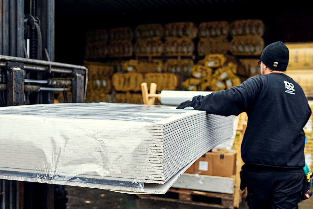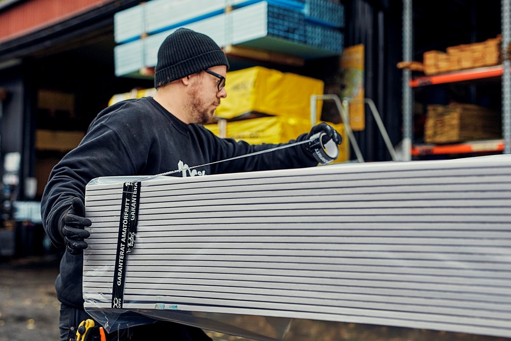 Håll ditt skivmaterial torrt och rent vid förvaring utomhus. Lösningen baseras på en smidig och stabil skyddshuv.
