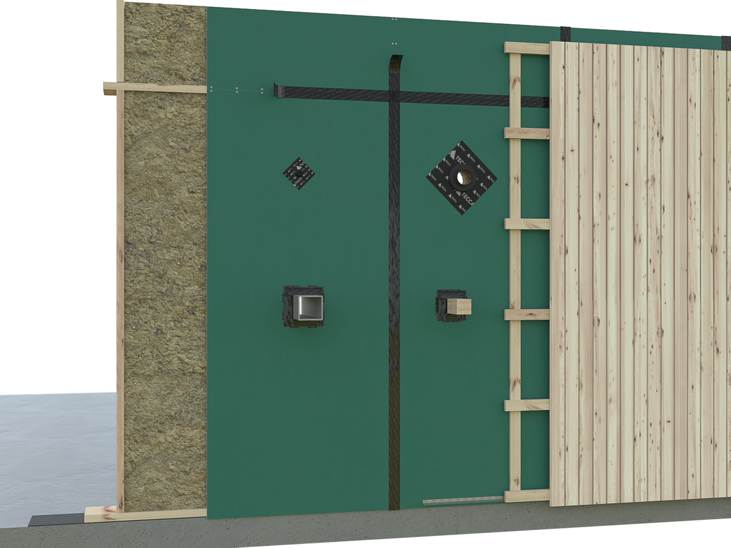 T-Flex Outdoor bruges som udvendig tape med traditionel isolering og indvendig tætningsbånd T-Flex. Spalteåbningen i bunden skal efterlades åben, når man bruger diffusionstæt tape i modsætning til Airtight-T